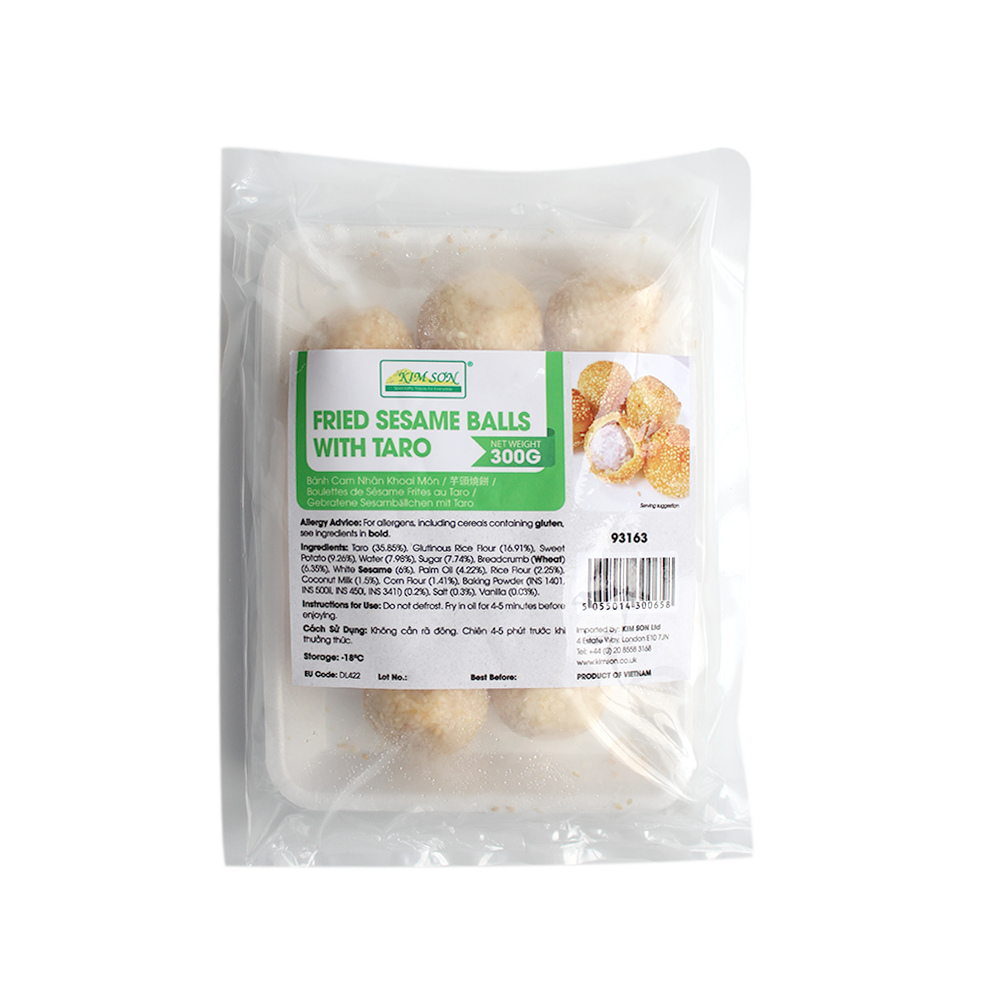 Ingredients List: Taro (35.85%), Glutinous Rice Flour (16.91%), Sweet Potato (9.26%), Water (7.98%), Sugar (7.74%), Breadcrumb (Wheat) (6.35%), White Sesame (6%), Palm Oil (4.22%), Rice Flour (2.25%), Coconut Milk (1.5%), Corn Flour (1.41%), Baking Powder (INS 1401, INS 500ii, INS 450i, INS 341i) (0.2%), Salt (0.3%), Vanilla (0.03%).