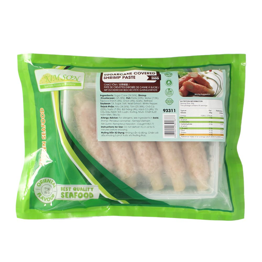 Ingredients List: Sugar Cane (34.26%), Shrimp (Crustacean) (25.38%), Fish Paste (22%), Water (7.5%), Tapioca Starch (4%), Onion (4%), Garlic, Refined Soybean Oil, Sugar, Salt, Yeast Extract, White Pepper.